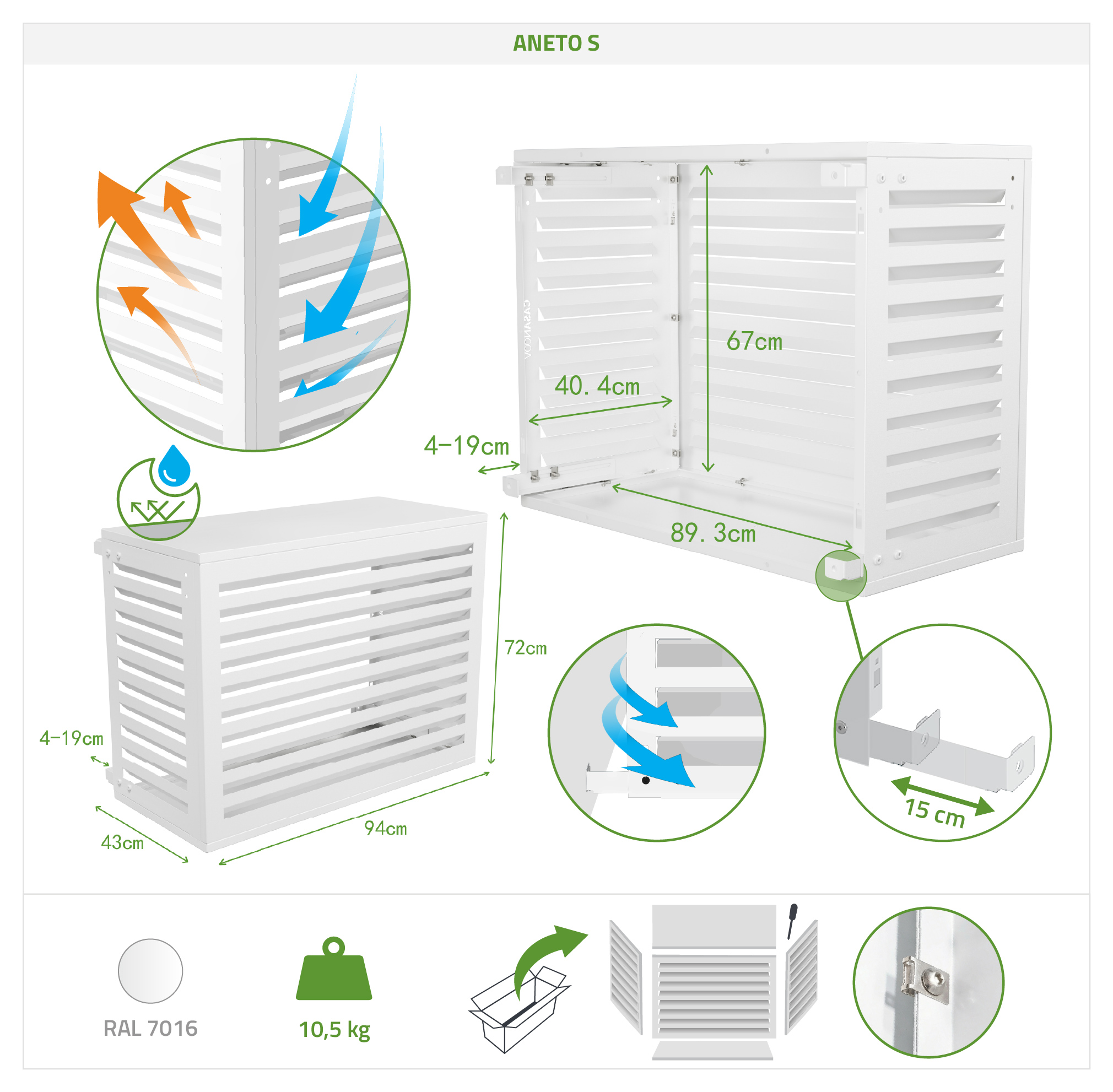 Le cache clim en aluminium Aneto séduit par son design à lames persiennes au charme discret et élégant. Sa conception en aluminium lui confère une finition soignée, une légèreté appréciable et une excellente résistance aux intempéries, idéale pour un usage extérieur durable. Grâce à ses lames ajourées, ce cache clim/cache pompe à chaleur permet une bonne ventilation de l’unité tout en la dissimulant avec raffinement. Un modèle au style sobre et intemporel, parfait pour s’intégrer harmonieusement à tous les types d’aménagements extérieurs. Les lames de ce cache clim sont réversibles, elles peuvent être installées vers le haut ou vers le bas, pour s'adapter au mieux au positionnement de votre clim ou pompe à chaleur.