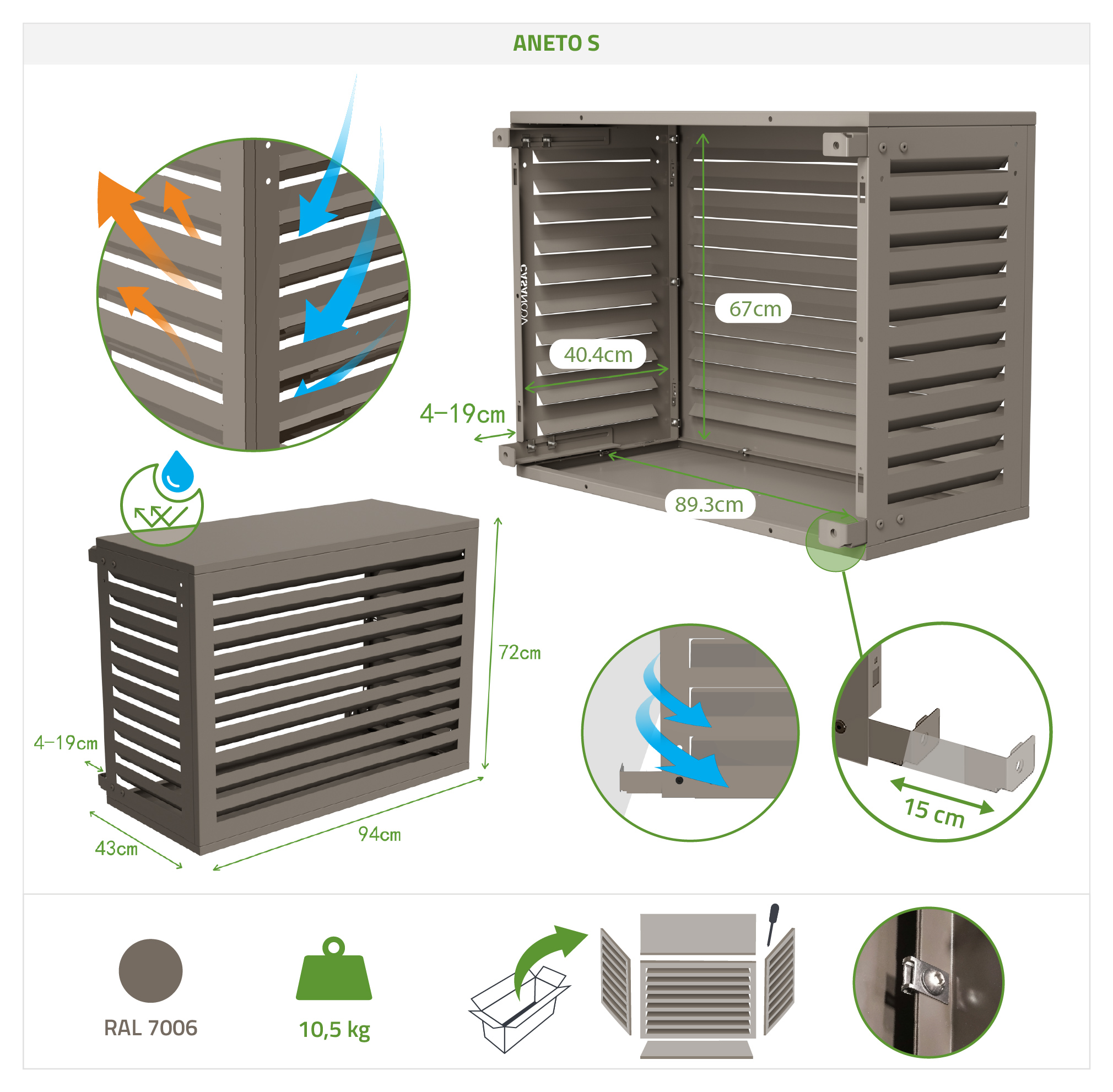 Le cache clim en aluminium Aneto séduit par son design à lames persiennes au charme discret et élégant. Sa conception en aluminium lui confère une finition soignée, une légèreté appréciable et une excellente résistance aux intempéries, idéale pour un usage extérieur durable. Grâce à ses lames ajourées, ce cache clim/cache pompe à chaleur permet une bonne ventilation de l’unité tout en la dissimulant avec raffinement. Un modèle au style sobre et intemporel, parfait pour s’intégrer harmonieusement à tous les types d’aménagements extérieurs. Les lames de ce cache clim sont réversibles, elles peuvent être installées vers le haut ou vers le bas, pour s'adapter au mieux au positionnement de votre clim ou pompe à chaleur.