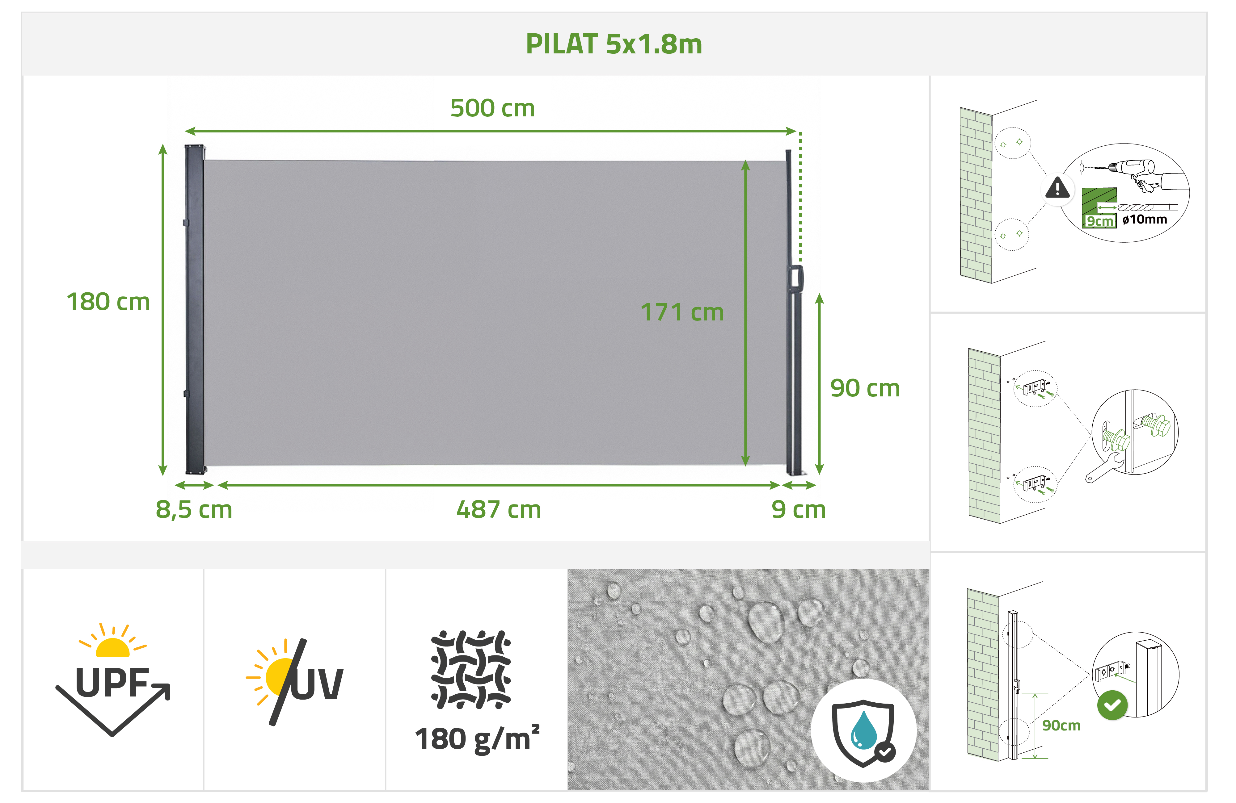 Das PILAT-Sortiment vereint Qualität, Robustheit und Eleganz. Jede Seitenmarkise besteht aus 180 g/m² schwerem Polyestergewebe, das wasserdicht und UV-beständig (SPF 50+) ist – perfekt, um Ihren Außenbereich in vollen Zügen zu genießen. Die Montage ist einfach, und die beidseitige Befestigung ermöglicht die Anpassung an die linke oder rechte Seite. Die 90 cm hohe, um 2° geneigte Säule garantiert optimale Gewebespannung, verhindert ein Durchhängen und sorgt für sorgenfreie Nutzung, selbst bei leichtem Wind. Das verzinkte und pulverbeschichtete Stahlgehäuse garantiert Stabilität und Langlebigkeit, während die mitgelieferte wasserdichte Abdeckung Ihre Markise im eingefahrenen Zustand schützt. Mit der PILAT-Serie verwandeln Sie Ihre Terrasse oder Ihren Balkon in einen gemütlichen, komfortablen und eleganten Ort.