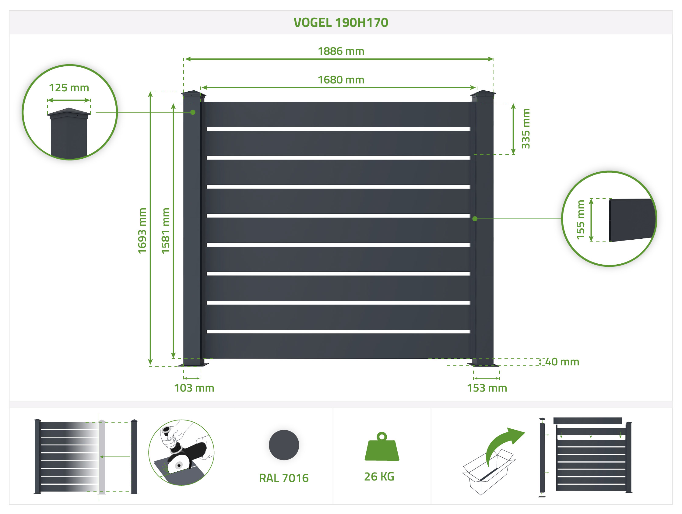 VOGEL 1,9 m H. 170 cm Graues Aluminium-Zaunelement 1