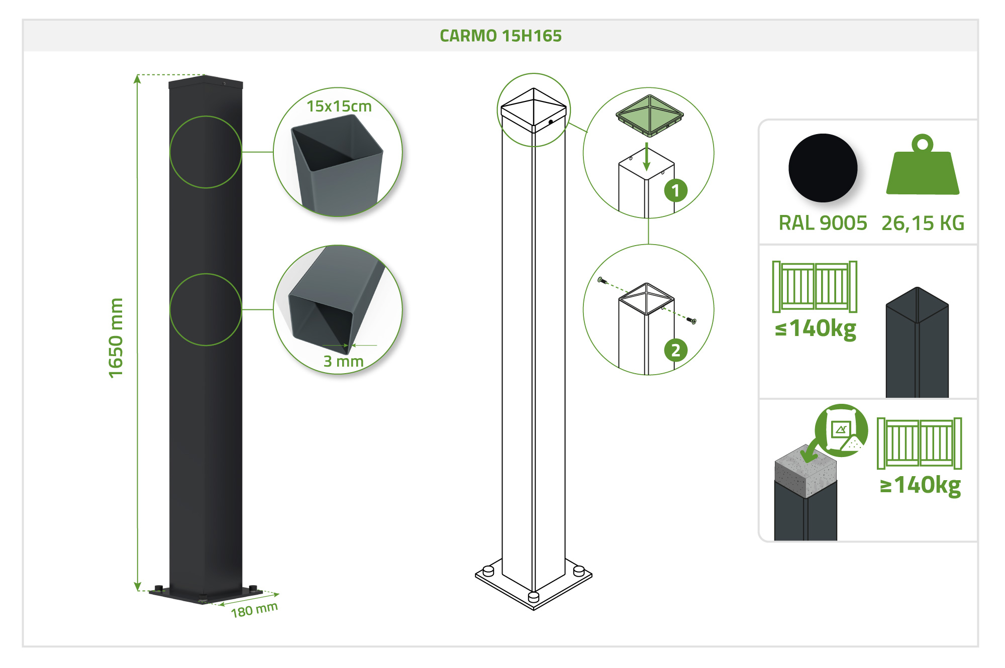 Ces poteaux en acier CARMO de 165 cm sont conçus pour l’installation des portails et portillons NALI de 160 cm de hauteur, offrant une tenue fiable et durable pour vos aménagements extérieurs.