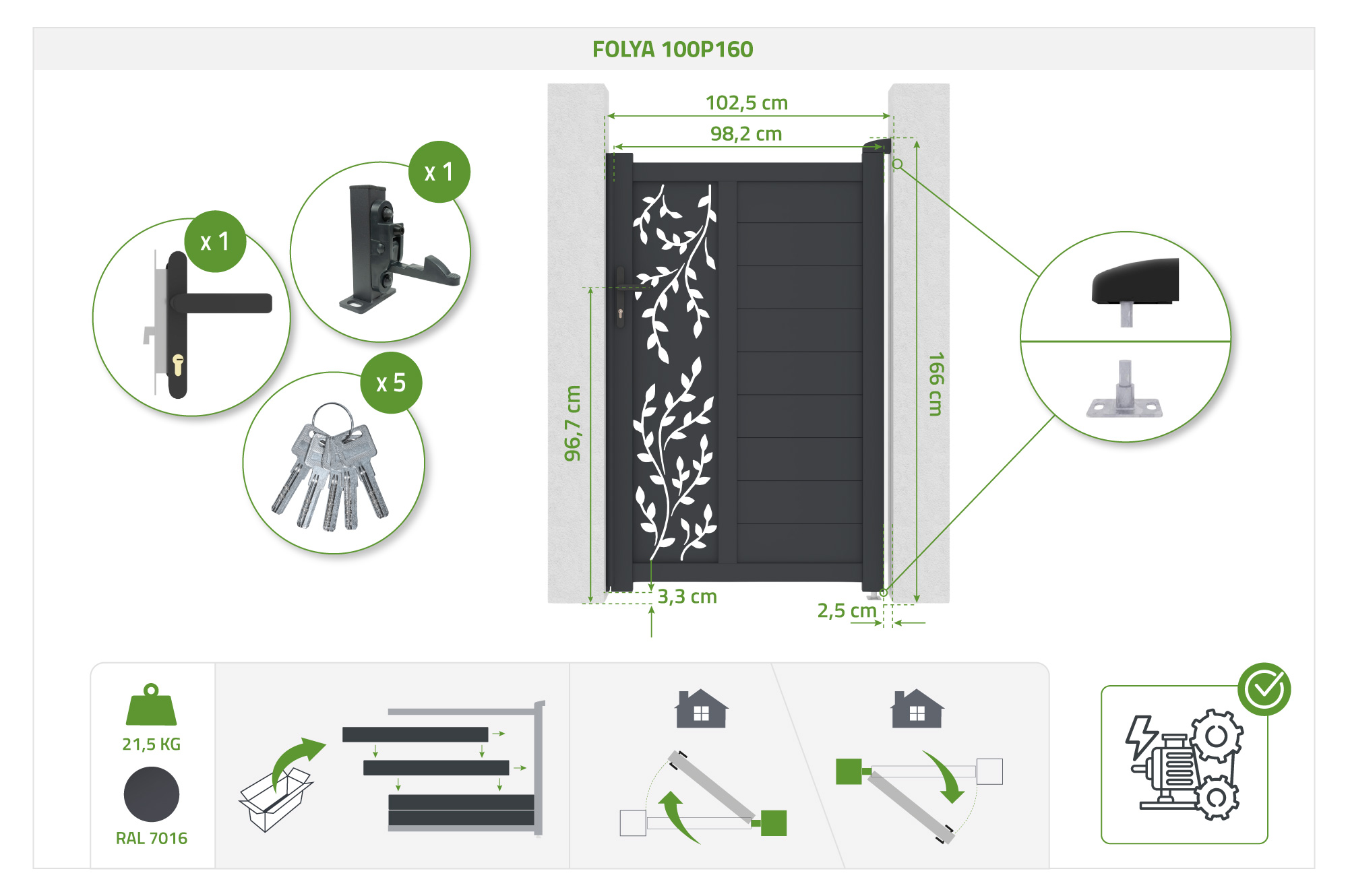 Tous les accessoires nécessaires à l’installation de votre portail vous sont fournis, et tout ce qui est inclus dans nos portails est précisé dans les caractéristiques techniques du produit ainsi que dans la description.